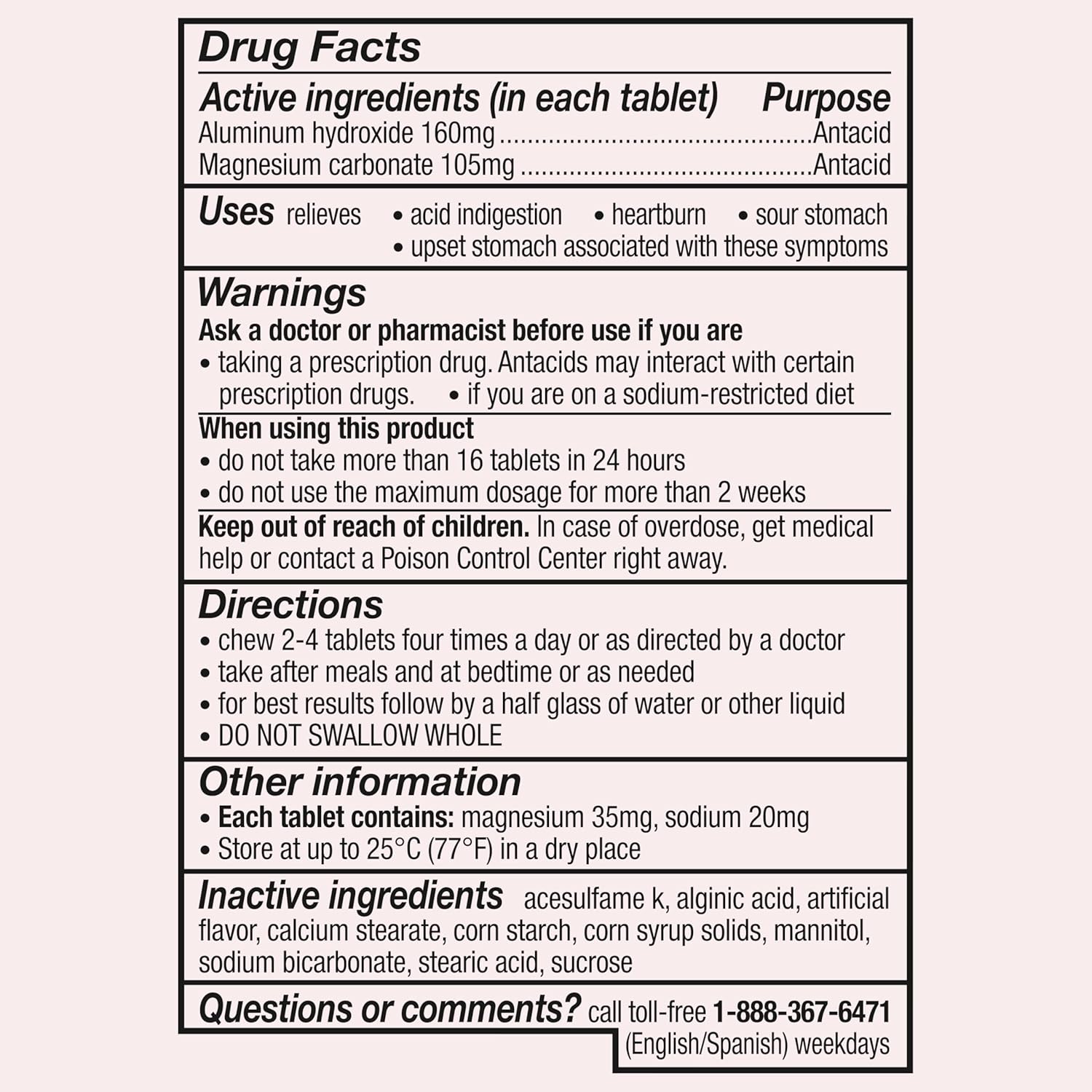 Each chewable tablet contains 160 mg Aluminum Hydroxide and 105 mg Magnesium Carbonate, the key active ingredients for acid neutralization.